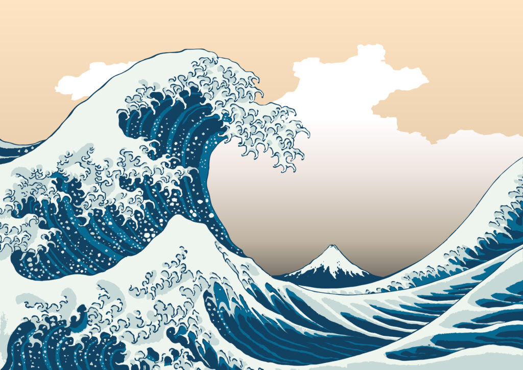 The towering wave, the fragile boats, and the distant Mount Fuji